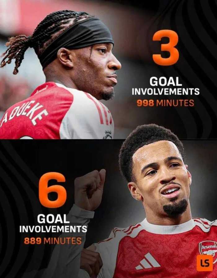 livescore发布一张数据对比图,阿森纳边锋马杜埃凯本赛季联赛出场时间达998分钟,但仅直接参与3粒进球。